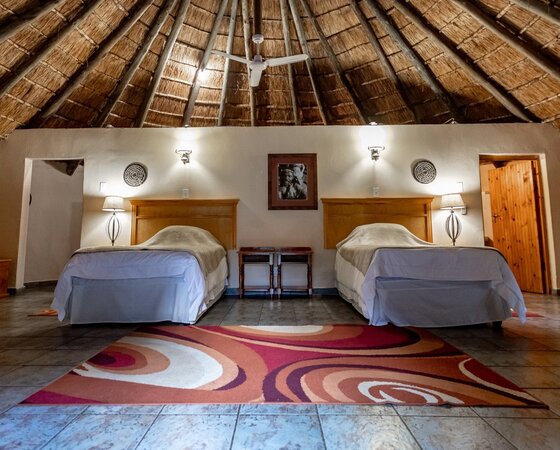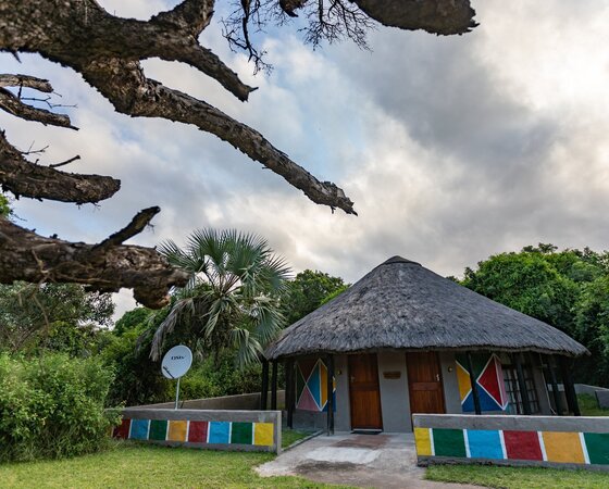 At Gooderson DumaZulu Lodge in Hluhluwe there are 31 rounded ethnic huts, housing twin rooms and double rooms, arranged in a circle around a central cattle kraal to resemble a traditional Zulu village.